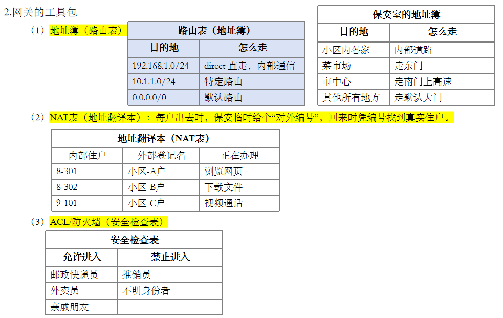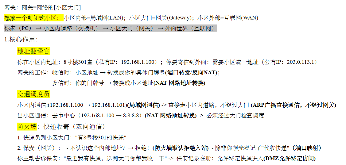 - 网关gateway:连接不同网络的重要设备,负责协议转换和数据转发,确保不同网络之间的通信。工作在OSI第3层及以上。