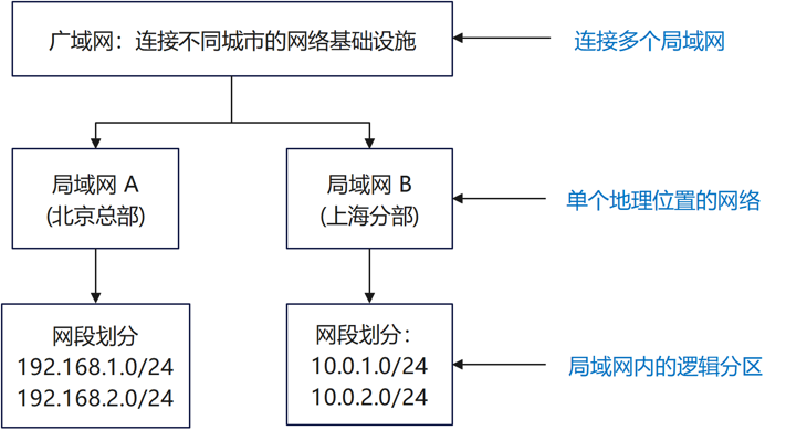 - 关系:划分子网后,一个局域网可包含多个网段。不同网段一定需要三层设备通信,而同一局域网内若在同一网段,可直接通信。
