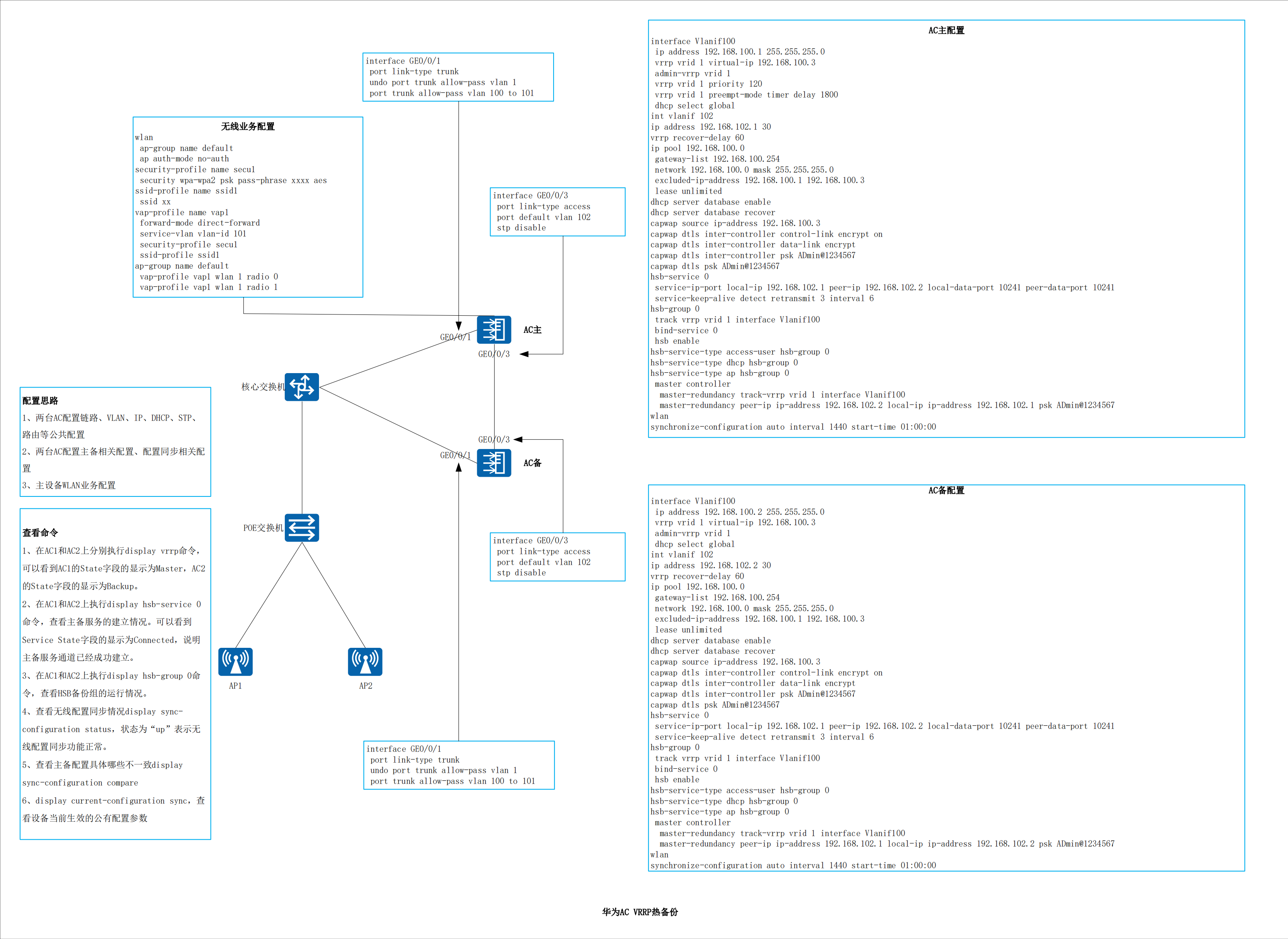 AC1-wlan-view\] synchronize-configuration auto interval 1440 start-time 01:00:00 #手动触发配置同步 synchronize-configuration y ### 4.4WLAN相关业务配置 wlan ap-group name default y ap auth-mode no-auth security-profile name secu1 security wpa-wpa2 psk pass-phrase xxxx aes ssid-profile name ssid1 ssid xx vap-profile name vap1 forward-mode direct-forward service-vlan vlan-id 101 security-profile secu1 ssid-profile ssid1 ap-group name default vap-profile vap1 wlan 1 radio 0 vap-profile vap1 wlan 1 radio 1 ### 4.5配置完成后的查看命令 1、在AC1和AC2上分别执行display vrrp命令,可以看到AC1的State字段的显示为Master,AC2的State字段的显示为Backup。 2、在AC1和AC2上执行display hsb-service 0命令,查看主备服务的建立情况。可以看到Service State字段的显示为Connected,说明主备服务通道已经成功建立。 3、在AC1和AC2上执行display hsb-group 0命令,查看HSB备份组的运行情况。 4、查看无线配置同步情况display sync-configuration status,状态为"up"表示无线配置同步功能正常。 5、查看主备配置具体哪些不一致display sync-configuration compare ### 4.6配置终端白名单 注意:开了白名单功能后,不在白名单的设备mac地址无法连接该网络 配置sta白名单(可选) sta-whitelist-profile name sta1 sta-mac xxxx-xxxx-xxxx sta-mac yyyy-yyyy-yyyy vap-profile name vap1 sta-whitelist-profile sta1