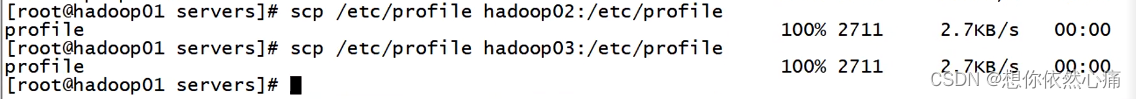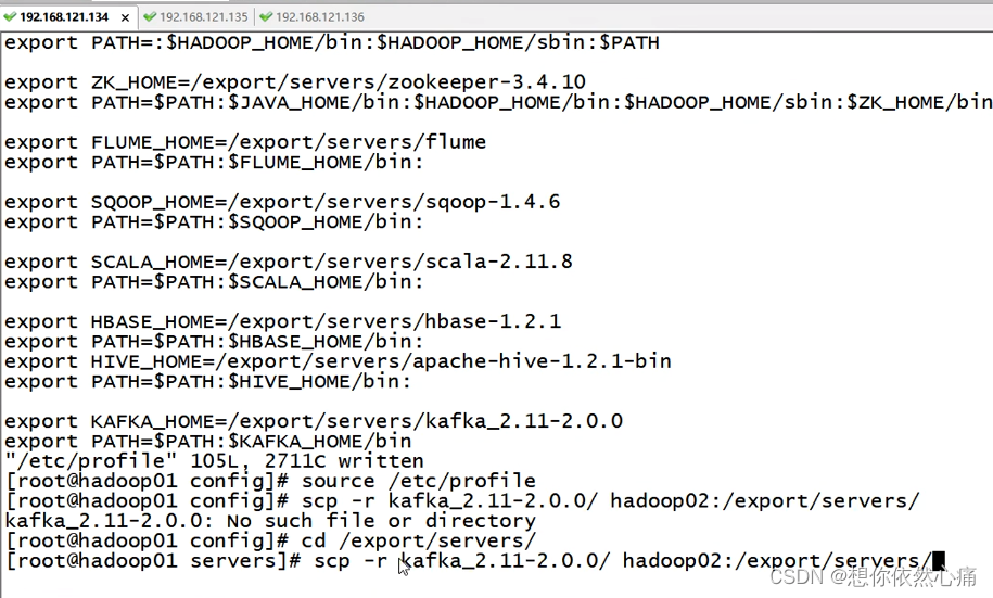 修改配置文件后,将Kafka本地安装目录/export/servers/kafka_ _2.11-2.0.0以及 环境变量配置文件/etc/profile分发至hadoop02、hadoop03机器, 命令如下(下面路径为相对路径,所以要先回到/export/servers目录下)。