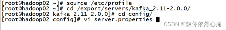 将hadoop02上的/export/servers/kafka_2.11-2.0.0/config/ server.properties配置中的参数修改: