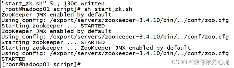 我们可以写一个一键启动脚本start_zk.sh来完成一键启动Zookeeper集群服务。具体命令如下: