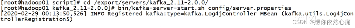 Zookeeper服务启动成功后,进入到Kafka的/export/servers/kafka_2.11-2.0.0目录下bin/kafka-server start.sh脚本启动Kafka服务了,命令如下。bin/kafka-server-start.sh config/server.properties