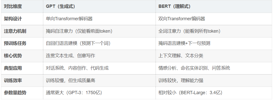 GPT和BERT代表了Transformer架构的两种主要应用范式: