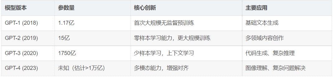 GPT系列的发展历程体现了自然语言处理领域的技术进步: