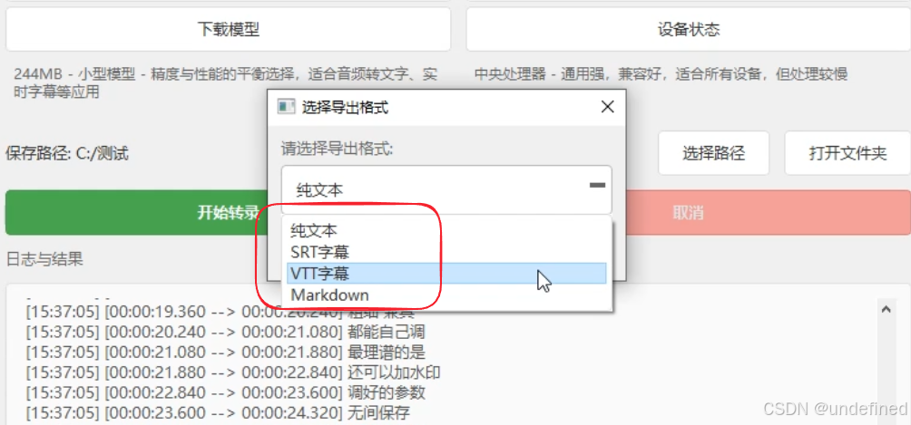 3、转换完成后,软件提供了纯文本,SRT/VTT 字幕以及Markdown几种字幕格式,选好格式直接导出即可。