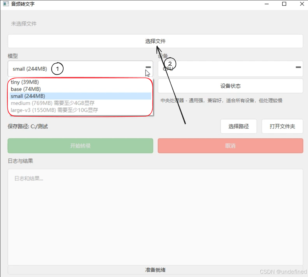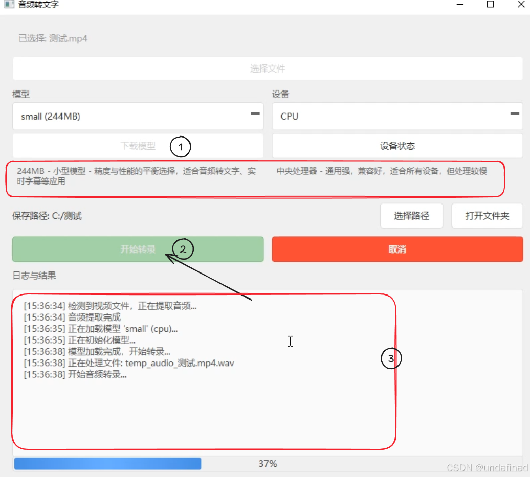 2、每个模型下方都有详细说明(适配不同语音类型、识别场景),根据自己的文件类型,选择对应模型,点击开始转换,识别进度会显示在日志下方显示卡内, 理论上模式越大识别效果越好。