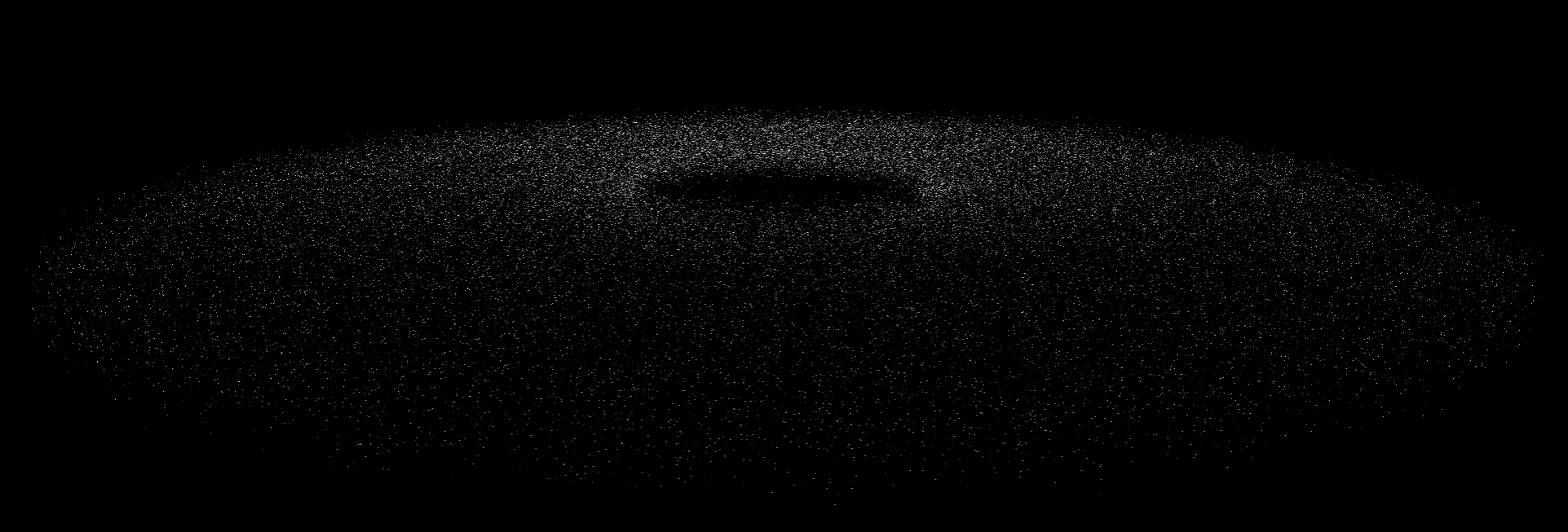 - 生成环形分布的大量粒子(10万级),形成内外半径固定的星环,粒子分布均匀协调;