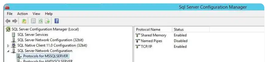 • 命名管道(Named Pipe)- 为局域网(LAN)开发的协议。默认是关闭的,需要通过 SQL 配置管理器(SQL Configuration Manager)开启。