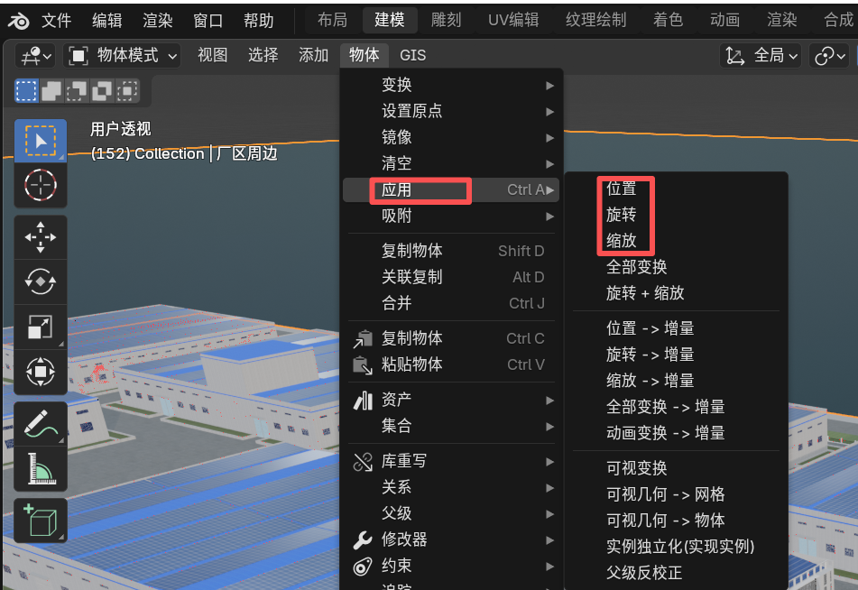 5.在物体模式下,点击"物体"→"应用"→"位置"、"旋转"、"缩放",这时候就可以了,当然了你偷懒的话,直接点击"全部变换"也可以,不过有时候会有点小问题要调整。