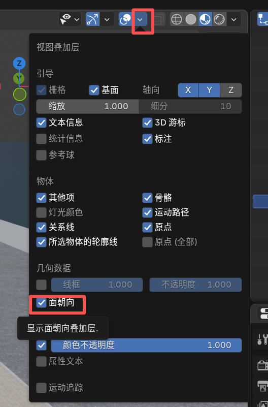 按照上图所示,点击"面朝向",然后将自己想要的朝向调整回来,红色的应该都是朝内的,发现红色立即调整过来,蓝色朝外,红色朝里。点击调整的面,然后 Alt+N,点击"翻转"。