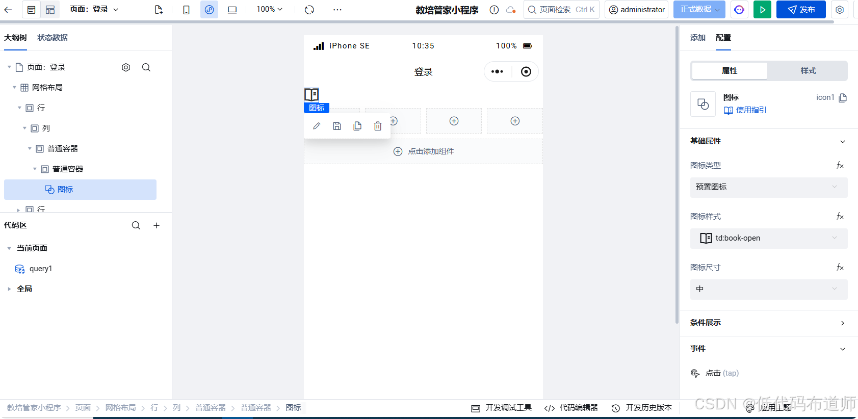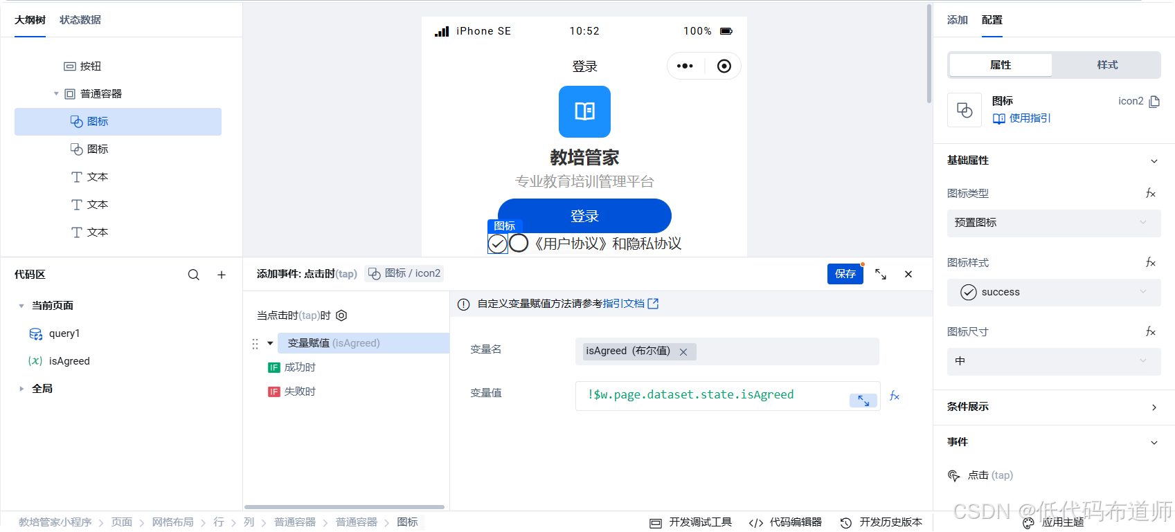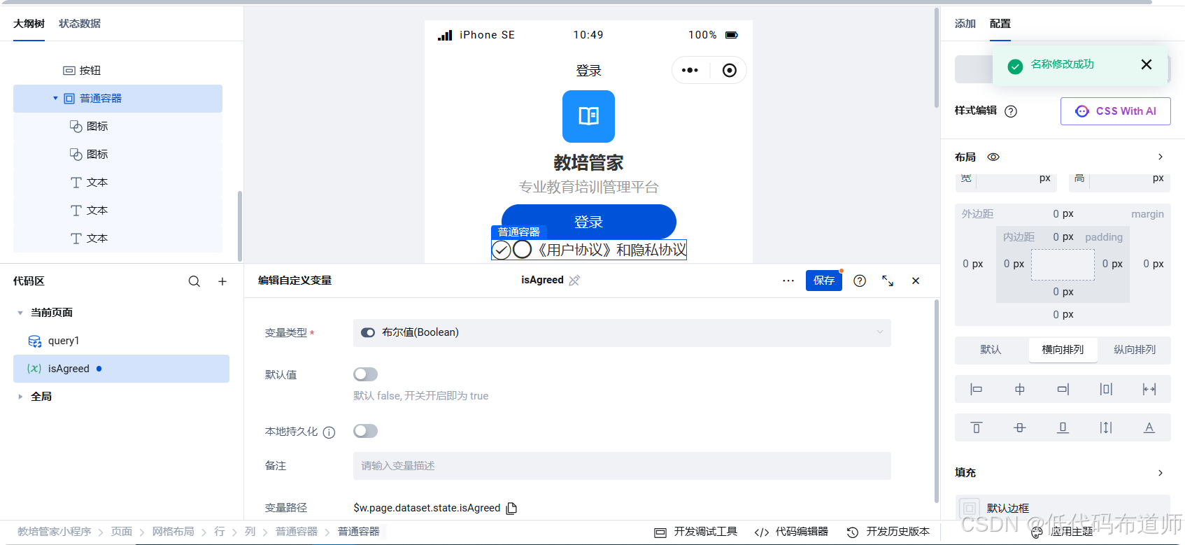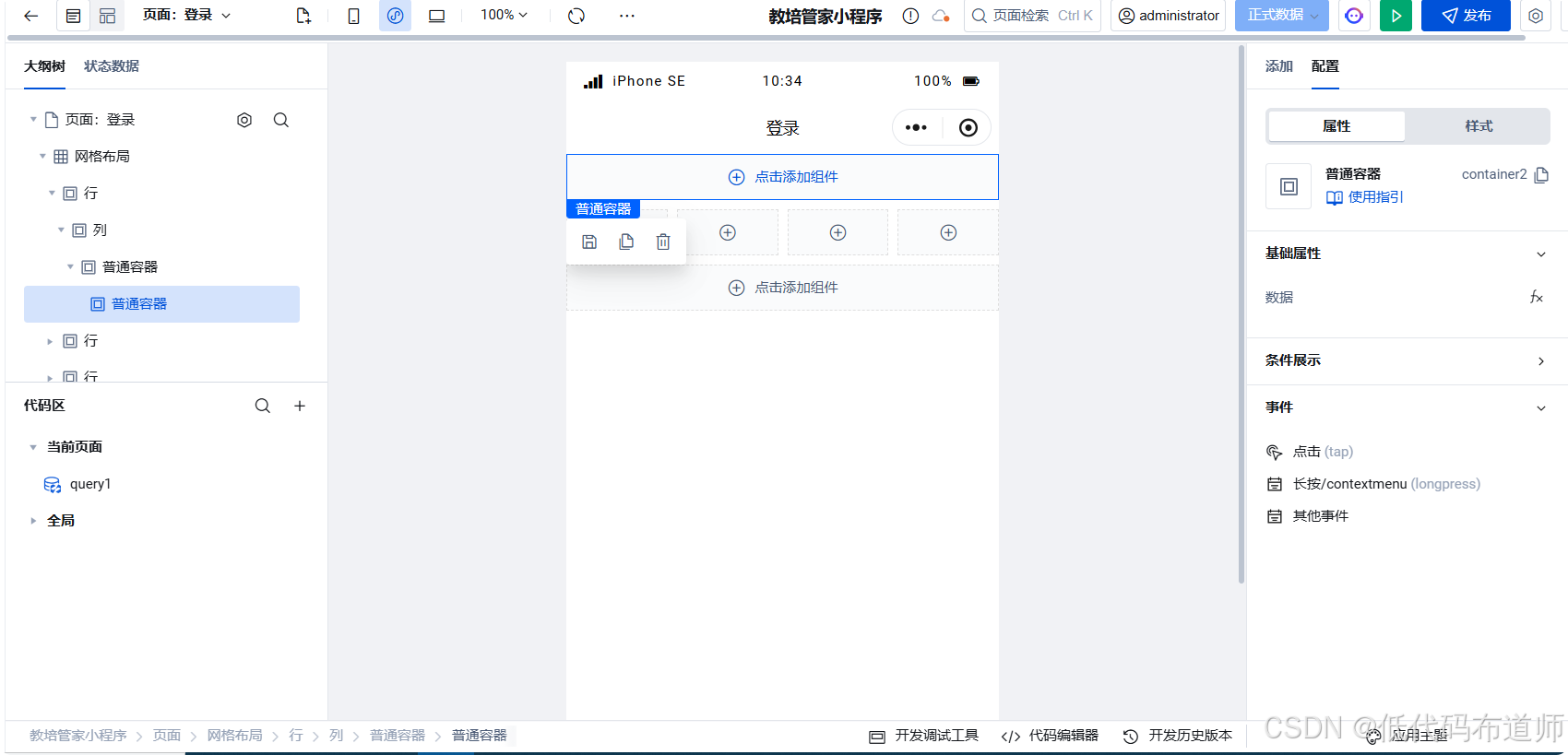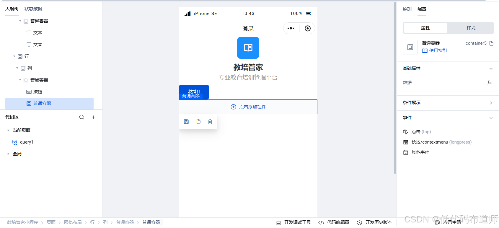 在微搭低代码中,我们需要通过"自定义方法"来实现点击登录按钮时的逻辑校验。