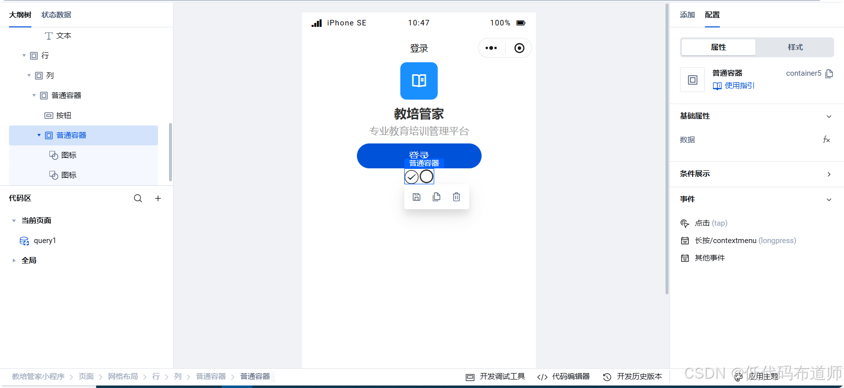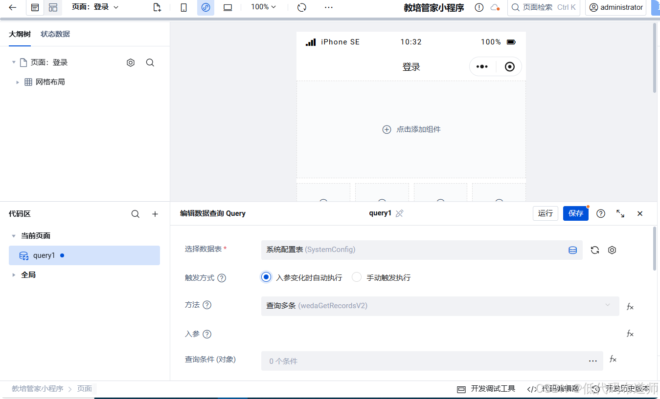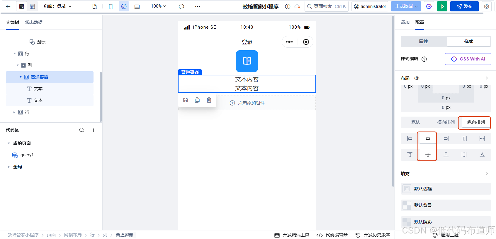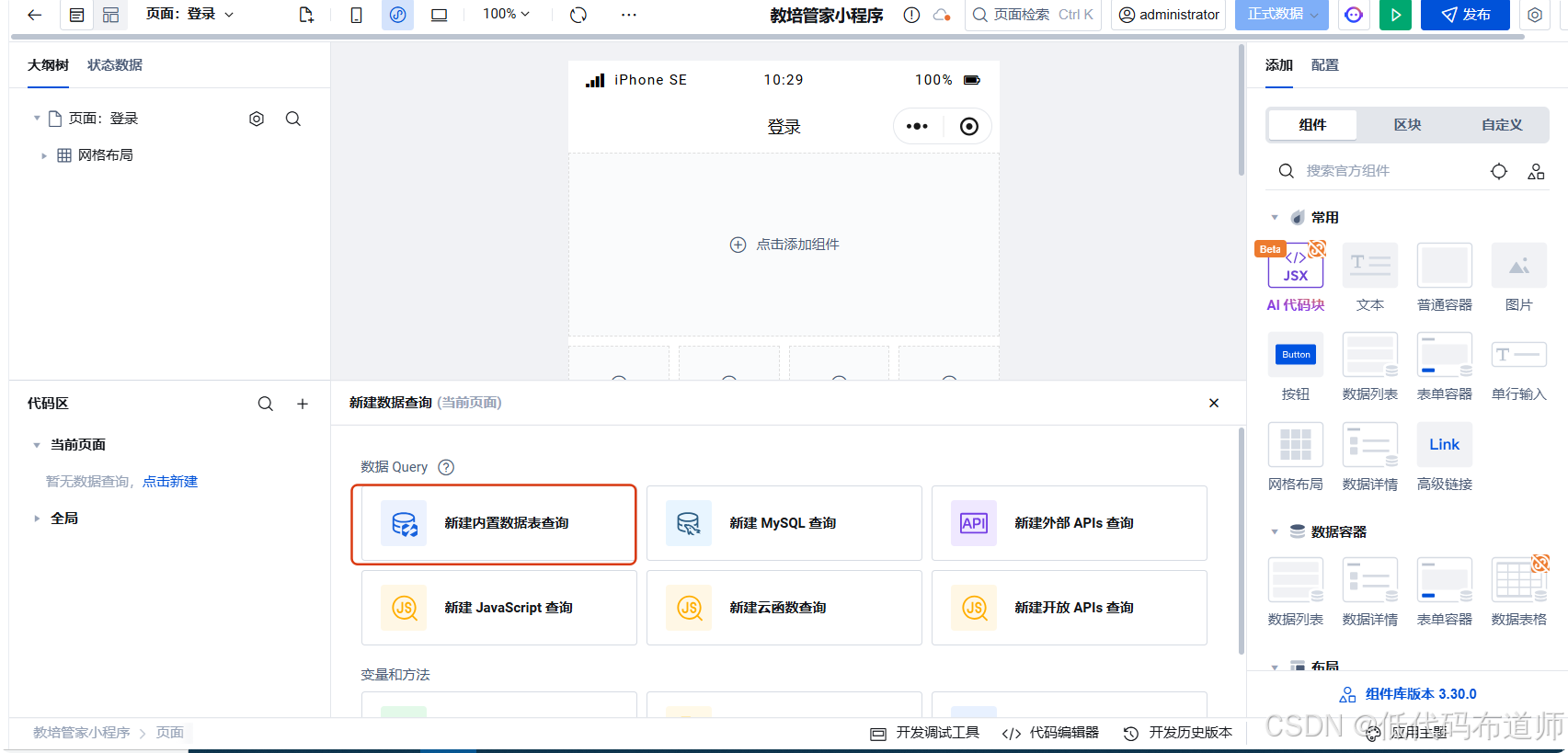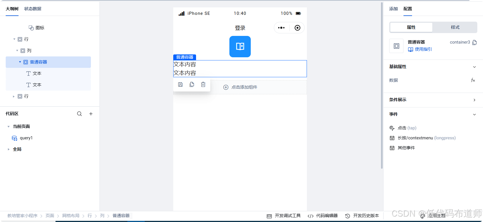 在微搭低代码中,我们需要通过"自定义方法"来实现点击登录按钮时的逻辑校验。