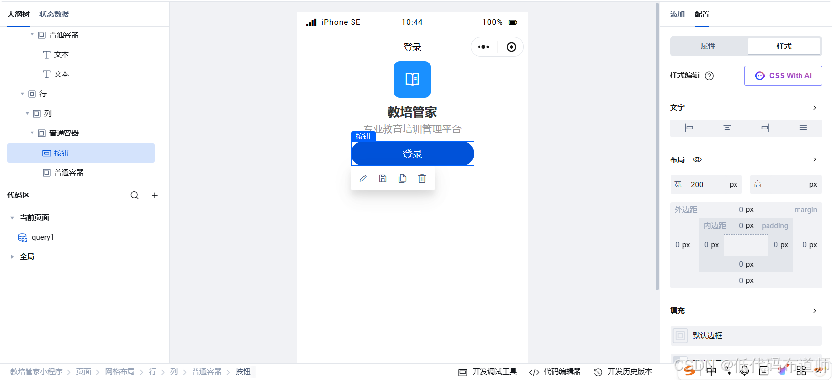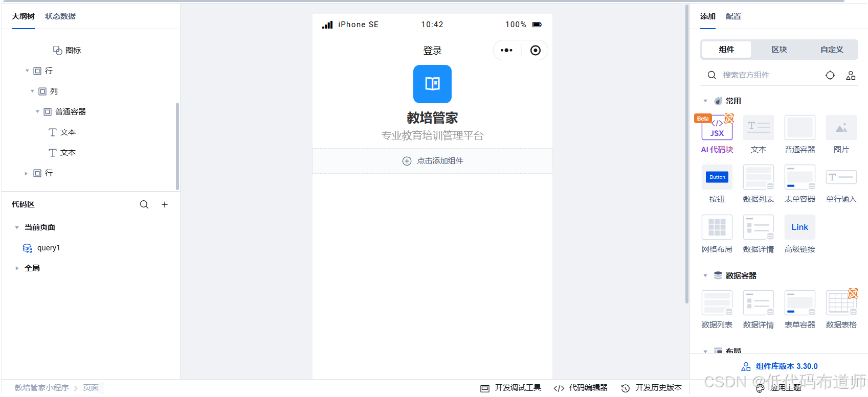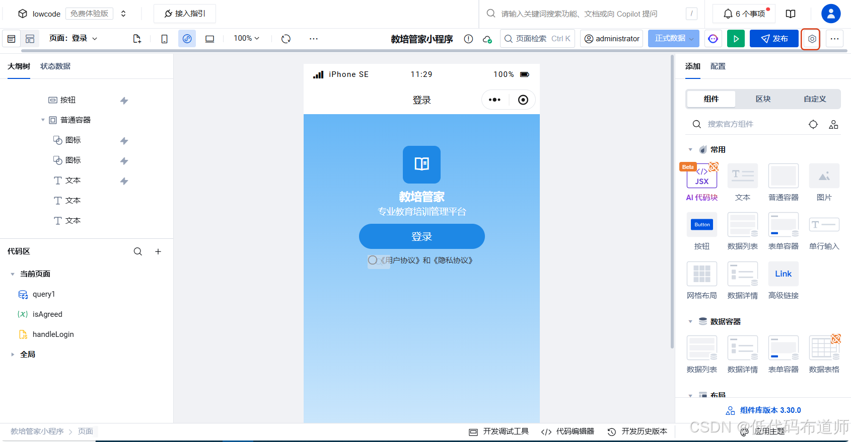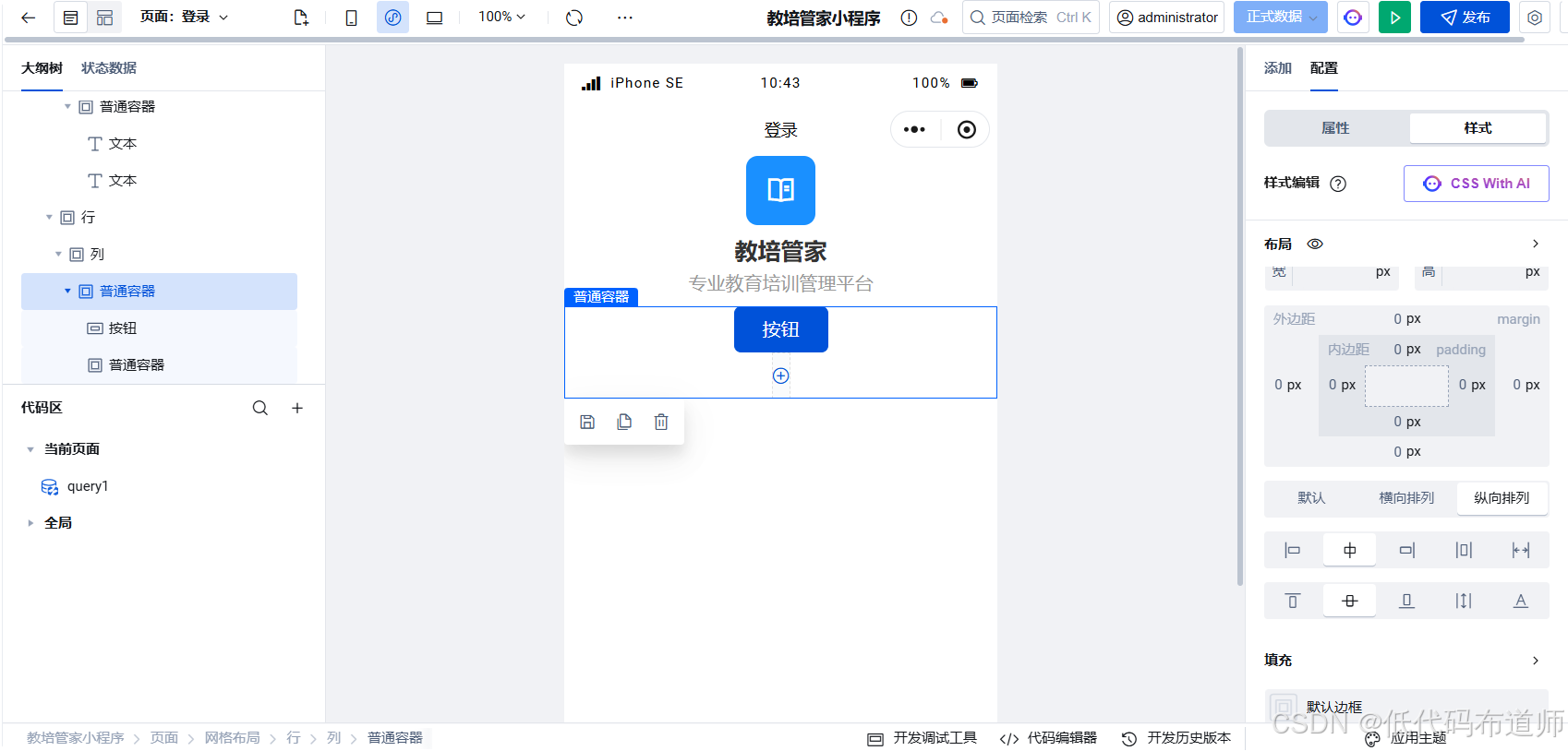 在微搭低代码中,我们需要通过"自定义方法"来实现点击登录按钮时的逻辑校验。