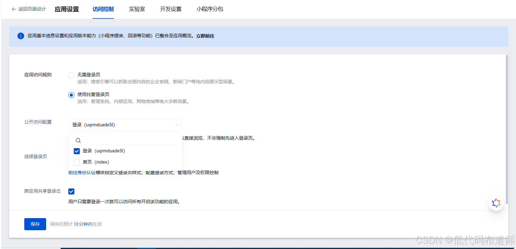 - 微搭权限控制:自从合并回云开发,如果不登录获取不到用户的身份信息,所以应用必须启用登录。