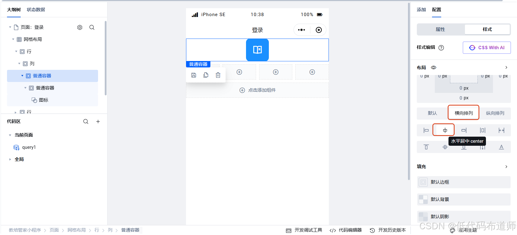 给外层的普通容器设置布局,设置为横向排列,水平居中