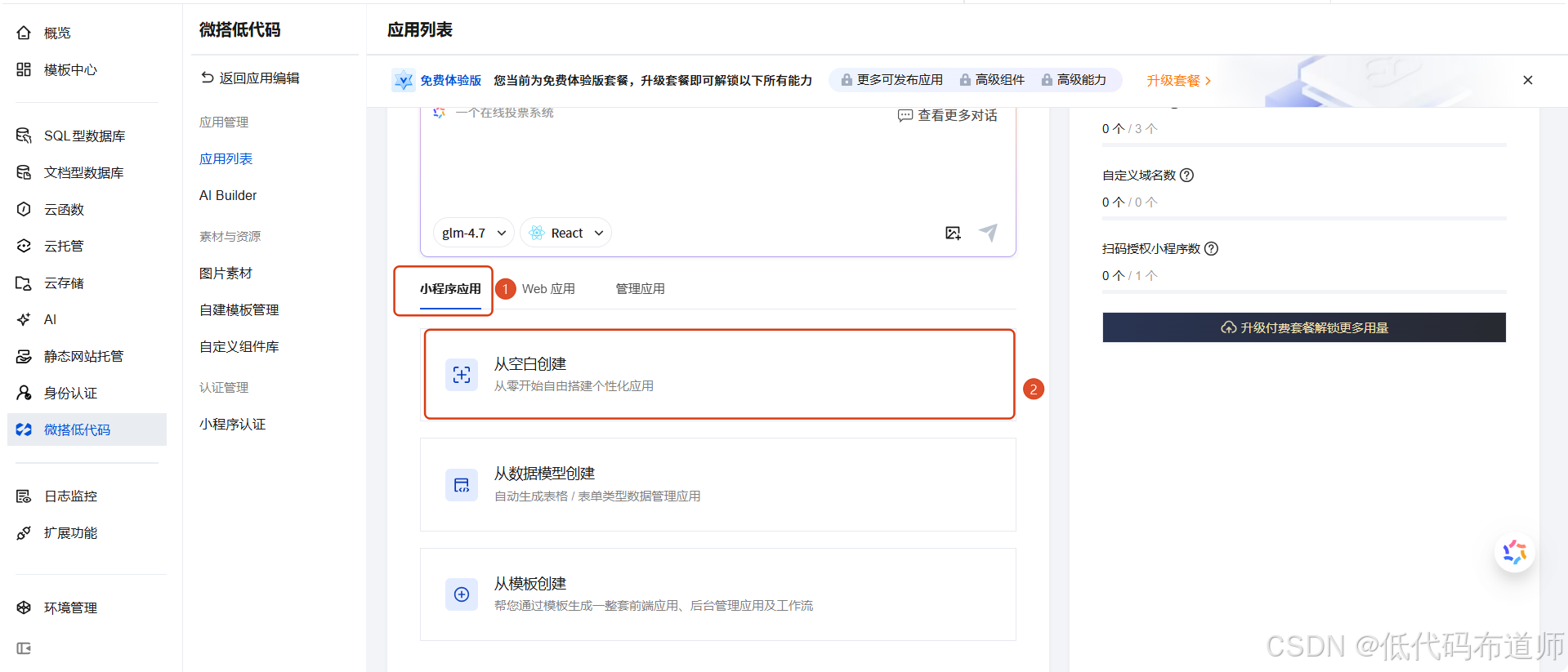 打开微搭低代码,切换到小程序应用,点击从空白新建