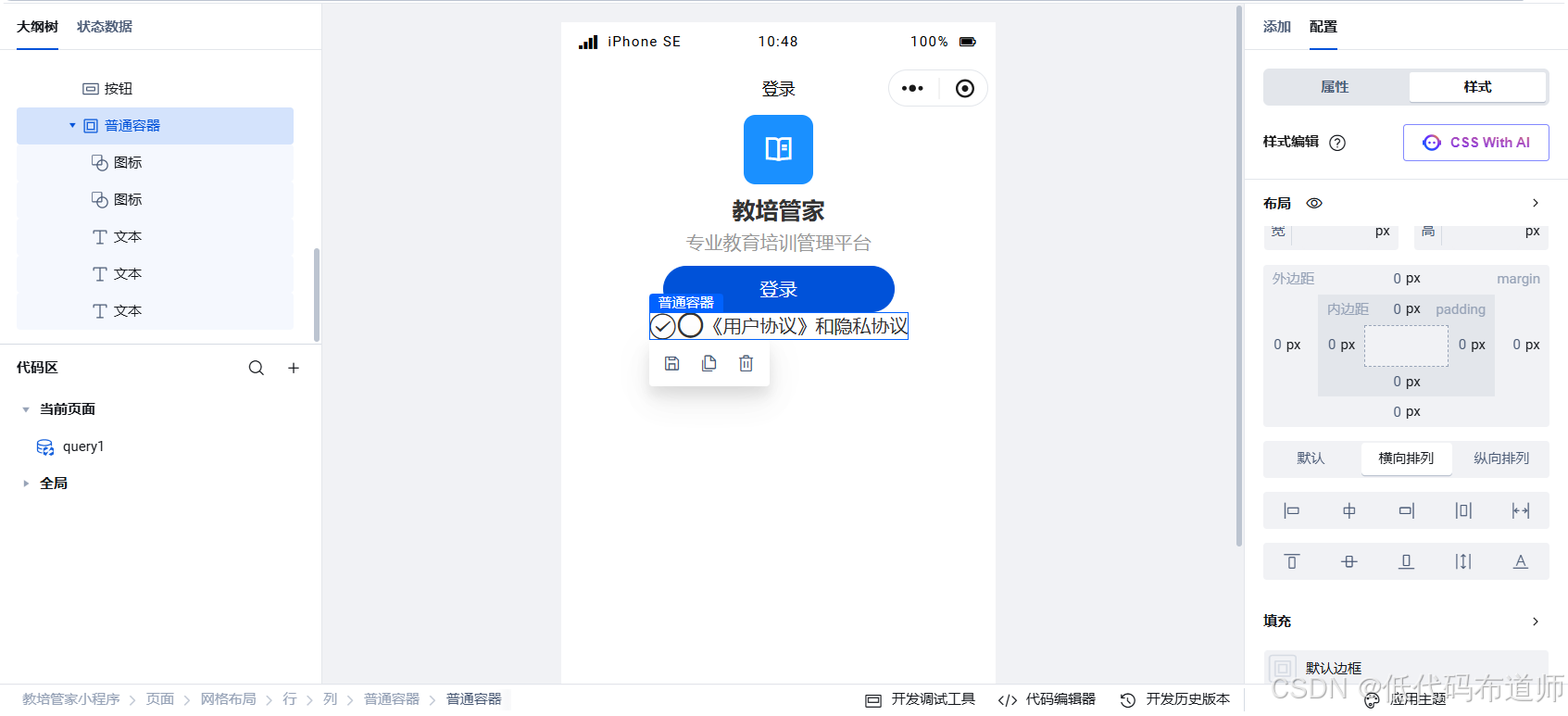 隐私协议这块我们自己搭建,如果用复选框组件还得覆盖样式比较麻烦