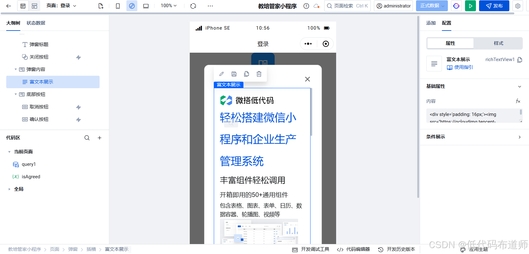 在页面组件中添加弹窗组件,里边添加富文本展示