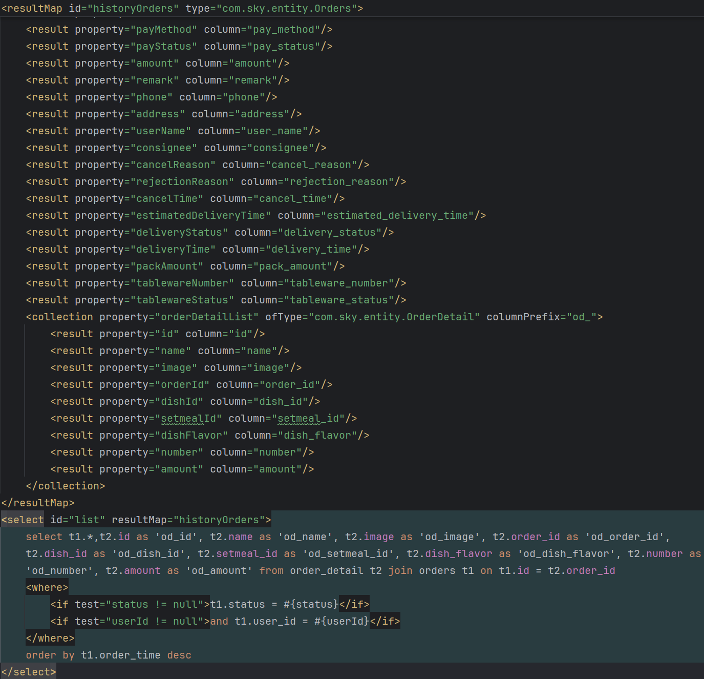 XML<resultMap id="historyOrders" type="com.sky.entity.Orders"> <result property="id" column="id"/> <result property="number" column="number"/> <result property="status" column="status"/> <result property="userId" column="user_id"/> <result property="addressBookId" column="address_book_id"/> <result property="orderTime" column="order_time"/> <result property="checkoutTime" column="checkout_time"/> <result property="payMethod" column="pay_method"/> <result property="payStatus" column="pay_status"/> <result property="amount" column="amount"/> <result property="remark" column="remark"/> <result property="phone" column="phone"/> <result property="address" column="address"/> <result property="userName" column="user_name"/> <result property="consignee" column="consignee"/> <result property="cancelReason" column="cancel_reason"/> <result property="rejectionReason" column="rejection_reason"/> <result property="cancelTime" column="cancel_time"/> <result property="estimatedDeliveryTime" column="estimated_delivery_time"/> <result property="deliveryStatus" column="delivery_status"/> <result property="deliveryTime" column="delivery_time"/> <result property="packAmount" column="pack_amount"/> <result property="tablewareNumber" column="tableware_number"/> <result property="tablewareStatus" column="tableware_status"/> <collection property="orderDetailList" ofType="com.sky.entity.OrderDetail" columnPrefix="od_"> <result property="id" column="id"/> <result property="name" column="name"/> <result property="image" column="image"/> <result property="orderId" column="order_id"/> <result property="dishId" column="dish_id"/> <result property="setmealId" column="setmeal_id"/> <result property="dishFlavor" column="dish_flavor"/> <result property="number" column="number"/> <result property="amount" column="amount"/> </collection> </resultMap> <select id="list" resultMap="historyOrders"> select t1.*,t2.id as 'od_id', t2.name as 'od_name', t2.image as 'od_image', t2.order_id as 'od_order_id', t2.dish_id as 'od_dish_id', t2.setmeal_id as 'od_setmeal_id', t2.dish_flavor as 'od_dish_flavor', t2.number as 'od_number', t2.amount as 'od_amount' from order_detail t2 join orders t1 on t1.id = t2.order_id <where> <if test="status != null">t1.status = #{status}</if> <if test="userId != null">and t1.user_id = #{userId}</if> </where> order by t1.order_time desc </select>由于Orders类里面存在字段orderDetailList,它属于List<OrderDetail>,业务逻辑要求我们在一次SQL语句中把每个订单对应的每一条订单明细数据OrderDetail的每个属性都做查询填充。因此单纯的resultType已经无法满足这种业务需求(一次SQL语句,属性里面套属性),需要使用.xml文件里面的resultMap,id属性是方便SQL语句对其进行引用,type属性则是返回结果封装到哪个类。内部就使用<result>标签先表示Orders主表字段,property属性是结果封装类里的属性名,column属性是SQL查询出的字段名(有别名优先别名,没有别名就是表中的字段名)。然后就是专门使用resultMap的情形所在(属性里面包属性),属性OrderDetail内又包含了多个属性,至于<collection>的使用是因为每个订单Orders类对应了多个OrderDetail类,即List,property属性依然是封装类Orders的属性名,ofType属性是这个集合的泛型类(of有种里面的意思就可以记成List里面的东西是什么?),columnPrefix主要是前缀(逻辑是<collection>内部的<result>的column属性加上这个前缀columnPrefix就是SQL查询OrderDetail属性内部属性时的字段名,同上别名或者order_detail表中字段名)。观察下面的select语句可以发现resultMap引用了上面的id,然后查order_detail表的时候我把这个表查出来的每个字段都取了别名"od_xx",大费周章的原因就是主表orders和联表order_detail表字段名有重复(如id、number....),如果放任重复直接查不取别名,那么就会出现两个表查询重复字段的结果,相互覆盖封装类的某个属性。可以发现<collection>内的<result>的column属性加上columnPrefix就刚好是select语句中给order_detail表每个字段取的别名。联表查询一个细节是order_detail join orders(join默认左外连接,因为接口文档要求order_detail属性必须返回,orders主表属性反而不是必须的,这么做就正好可以以order_detail为主)。后面的话就是按照status和userId动态查询,并且按照下单时间倒序排序,符合产品原型要求。