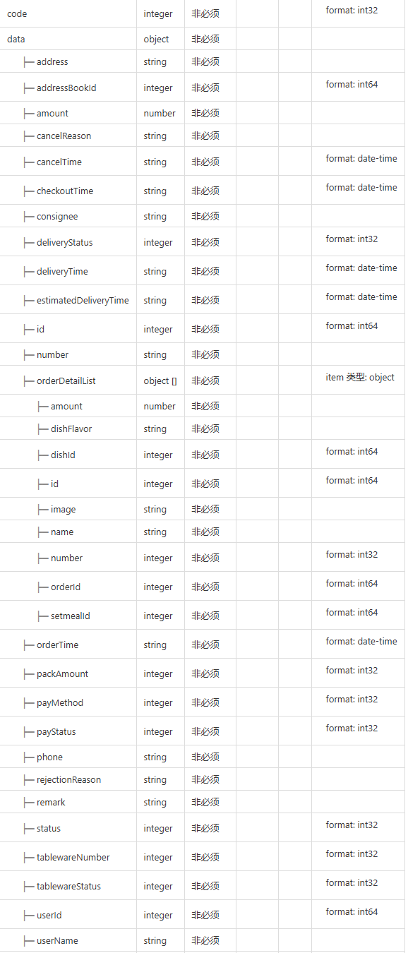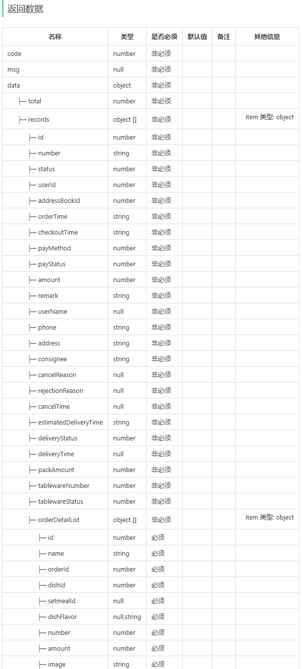 从请求参数page和pageSize可以看出这个查询是做一个分页查询操作,还有个status通过观察产品原型可以发现有全部订单、待付款、已取消三种选项页面,推出这个status到时候就是通过一个动态SQL查询,条件status,当然还有个userId作为条件,正好这三个参数可以用自定义DTO类OrdersPageQueryDTO封装。分析返回值可以使用Orders进行封装SQL语句查询结果,需要注意orderDetailList字段是个List<OrderDetail>,OrderDetail类的所有字段属性都来自另一个表order_detail,因此需要联表查询,可以通过一次Select语句完成全部属性的封装,在.xml文件里面利用resultMap、<result>、<collection>,由于两张表一次性查存在重复字段,需要给其中一张表的查询字段添加统一前缀(别名)进行区分,防止封装时属性相互覆盖。