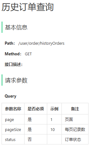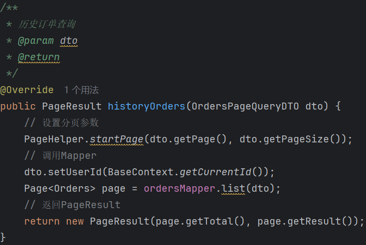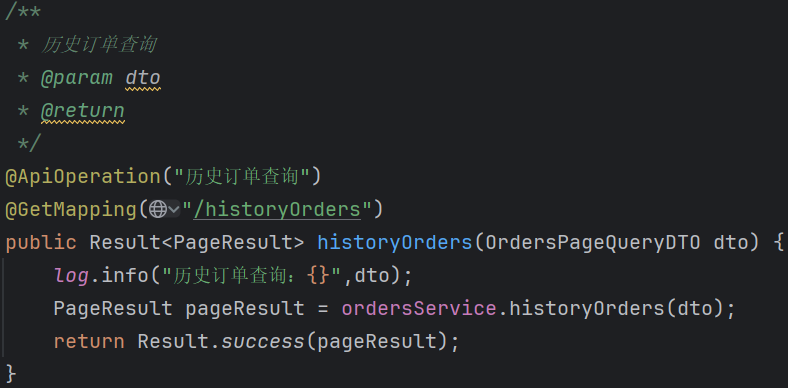 java/** * 历史订单查询 * @param dto * @return */ @ApiOperation("历史订单查询") @GetMapping("/historyOrders") public Result<PageResult> historyOrders(OrdersPageQueryDTO dto) { log.info("历史订单查询:{}",dto); PageResult pageResult = ordersService.historyOrders(dto); return Result.success(pageResult); }Controller层直接调Service层即可,分页查询返回结果为PageResult类。