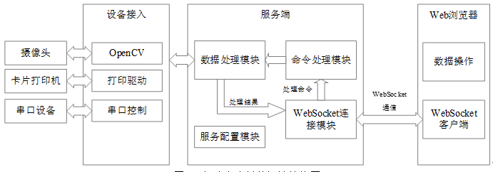 为突破Web应用访问本地硬件设备被浏览器限制的问题,本方案中将用户所使用的浏览器作为WebSocket的客户端,用户本地系统作为WebSocket的服务端,总体解决方案设计见图1所示。服务端WebSocket连接模块用于接收来自浏览器的连接请求并将服务端的处理结果以规定的数据格式向浏览器做出响应;命令处理模块负责将接收到的格式消息转换成对设备操作的命令;数据处理模块负责调用具体的设备SDK从而实现硬件设备操作;服务配置模块负责服务端的参数配置,如服务端端口配置、认证账户、密码安全性配置等。