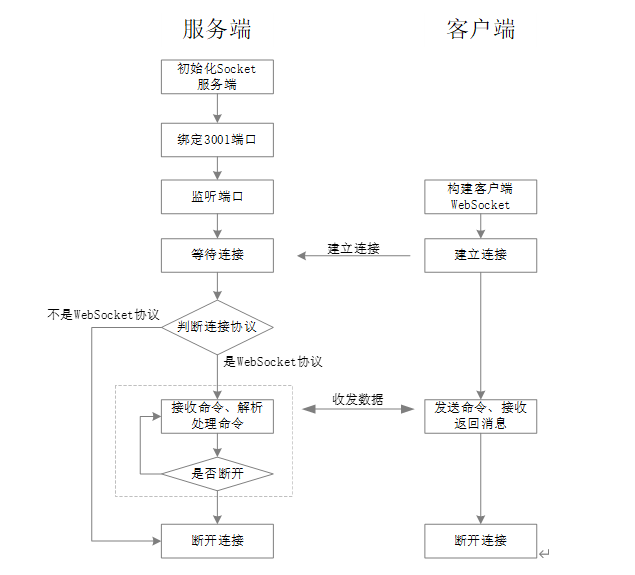 服务端创建一个Socket网络服务程序,绑定并监听端口(默认3001),然后等待客户端连接。来自客户端的连接必须是WebSocket协议,当服务端发现连接不是WebSocket协议时将自动断开此连接。如果客户端连接采用了WebSocket协议,服务端将创建新线程用于接收、解析和执行来自客户端的命令。服务端无法识别的命令将被忽略。服务端发现客户端已断开连接时,将回收此线程的相关资源。服务端与客户端的连接处理过程见图2所示。