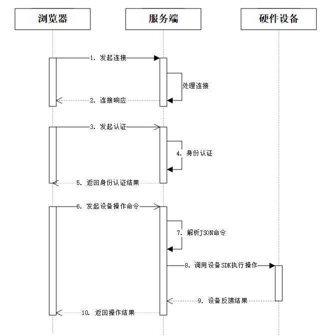 客户端(浏览器)操作硬件设备流程见图3所示。客户端连接上服务端后(第1、2步),首先要进行连接身份认证(第3、4、5步),服务端通过身份认证后,客户端可发起设备操作,否则服务端将断开连接。客户端连接通过身份认证后,可发起对设备操作的命令,命令以JSON格式异步发送给服务端(第6步),服务端解析JSON格式并识别命令(第7步),选择与命令对应的设备SDK并执行该设备操作(第8步),然后将设备操作的反馈信息返回到客户端(第9、10步)。