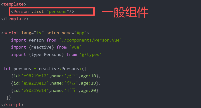 html父组件中: <Game v-slot="params"> <!-- <Game v-slot:default="params"> --> <!-- <Game #default="params"> --> <ul> <li v-for="g in params.games" :key="g.id">{{ g.name }}</li> </ul> </Game> 子组件中: <template> <div class="category"> <h2>今日游戏榜单</h2> <slot :games="games" a="哈哈"></slot> </div> </template> <script setup lang="ts" name="Category"> import {reactive} from 'vue' let games = reactive([ {id:'asgdytsa01',name:'英雄联盟'}, {id:'asgdytsa02',name:'王者荣耀'}, {id:'asgdytsa03',name:'红色警戒'}, {id:'asgdytsa04',name:'斗罗大陆'} ]) </script>