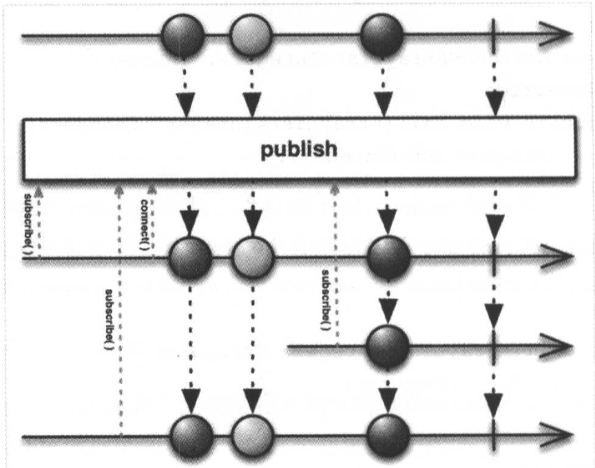 publish操作符就是用来将一个普通的Observable转化为一个Connectable Observable的。需要注意的是,如果发送数据已经开始了再进行订阅的话,就只能接收以后发送的数据。其示意图如图所示。