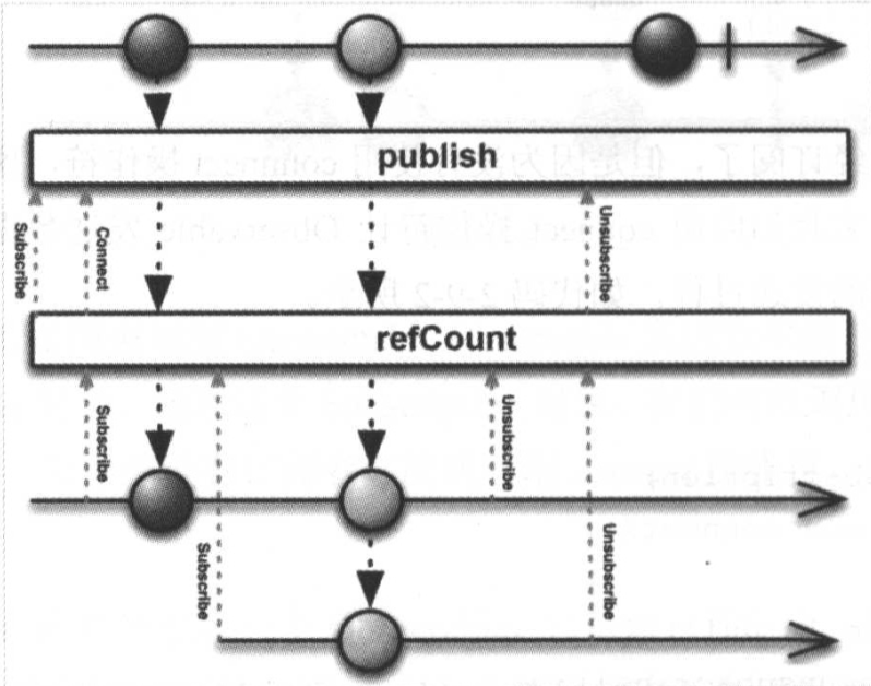 refCount操作符能够将一个Connectable Observable对象再重新转化为一个普通的Observable对象,这时候如果有订阅者进行订阅将会触发数据的发送,其示意图如图所示。
