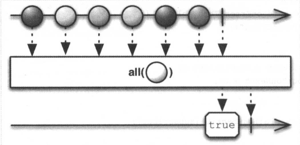 al操作符根据一个函数对源Observable发送的所有数据进行判断,最终返回的结果就是这个判断结果。这个函数使用源Observable发送的数据作为参数,内部判断所有的数据是否满足我们定义好的判断条件,如果全部都满足则返回true,否则就返回false,其示意图如图所示。