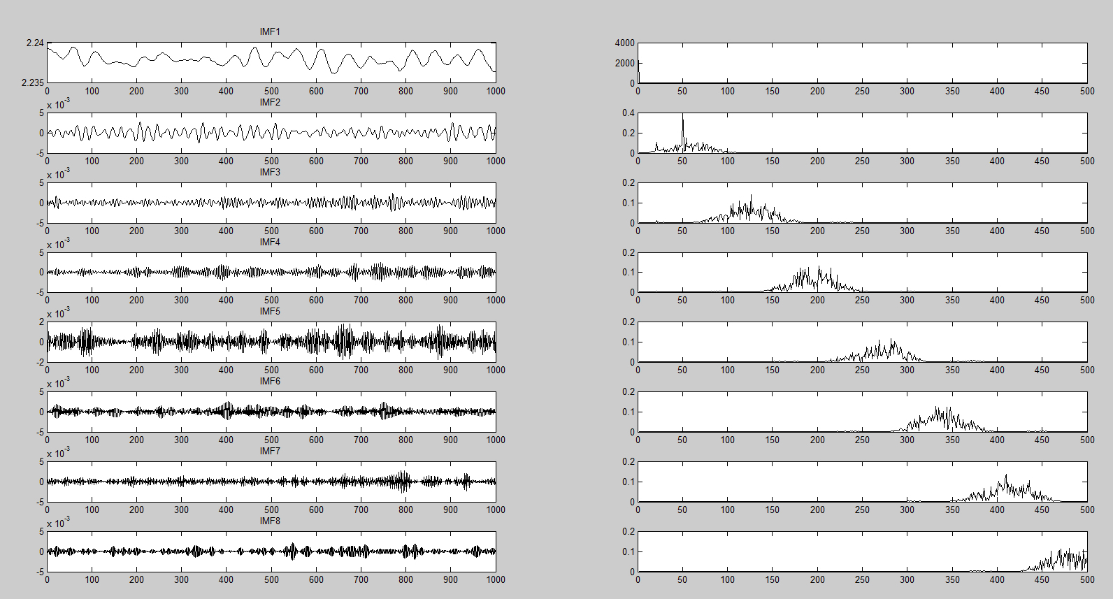 - 频域频谱:对每个IMF分量进行FFT变换,绘制0~Fs/2范围内的频谱,标注对应IMF序号。