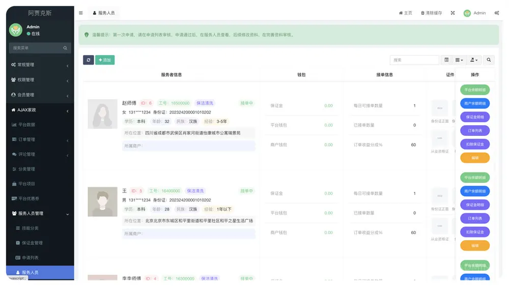 - 信息管理:详细记录服务人员各项信息,涵盖姓名、工号、服务项目(如保洁清洗)、身份证号、学历、年龄、民族、经验、所在位置、所属商户等,便于平台全面掌握服务人员情况。