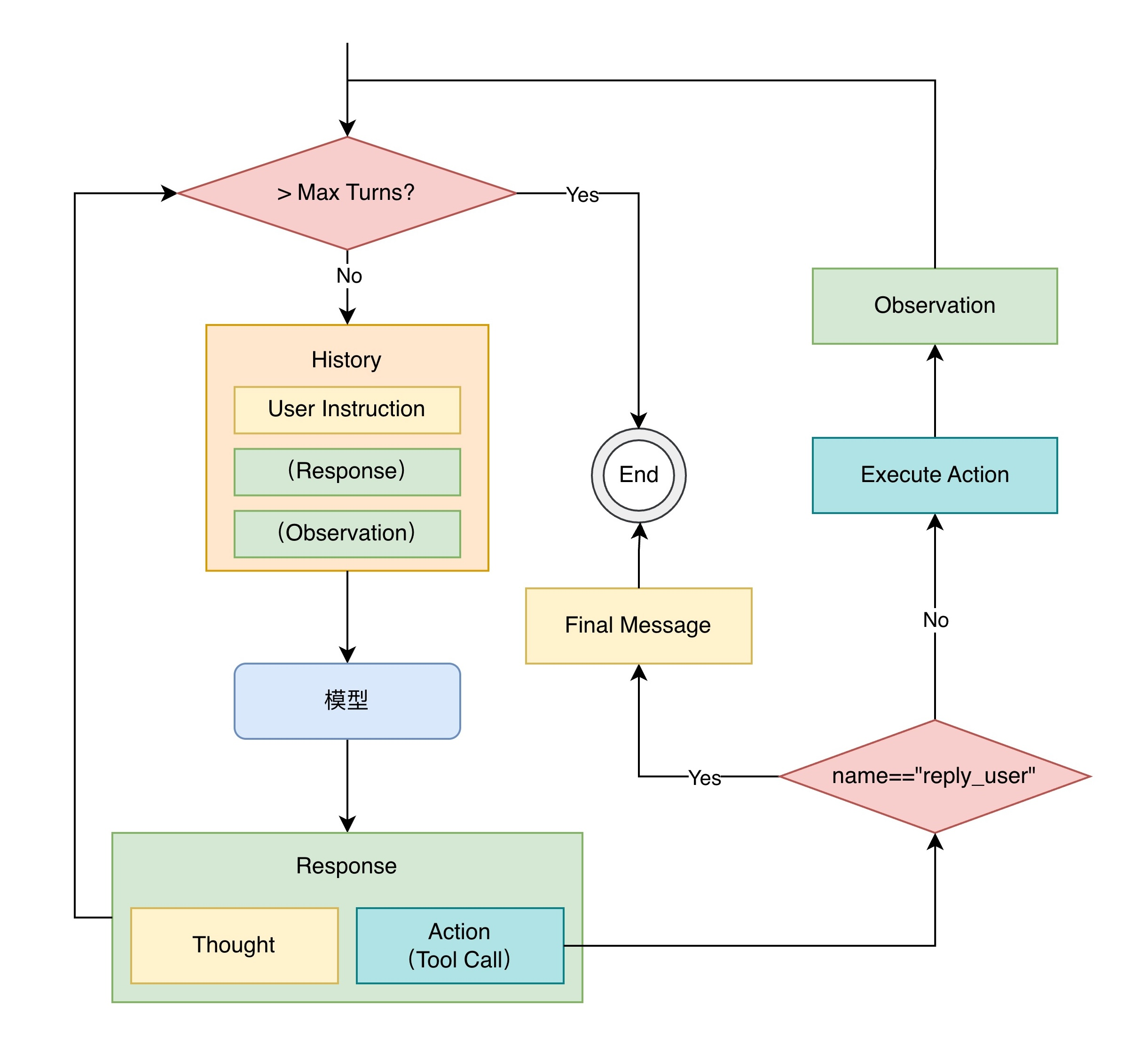 为了让模型真正具备Agent能力,我们实现了一个基于ReAct(Reasoning + Acting)的推理循环。模型不仅仅是回答问题,而是主动发起Action,由系统执行后将Observation反馈给模型,形成闭环。