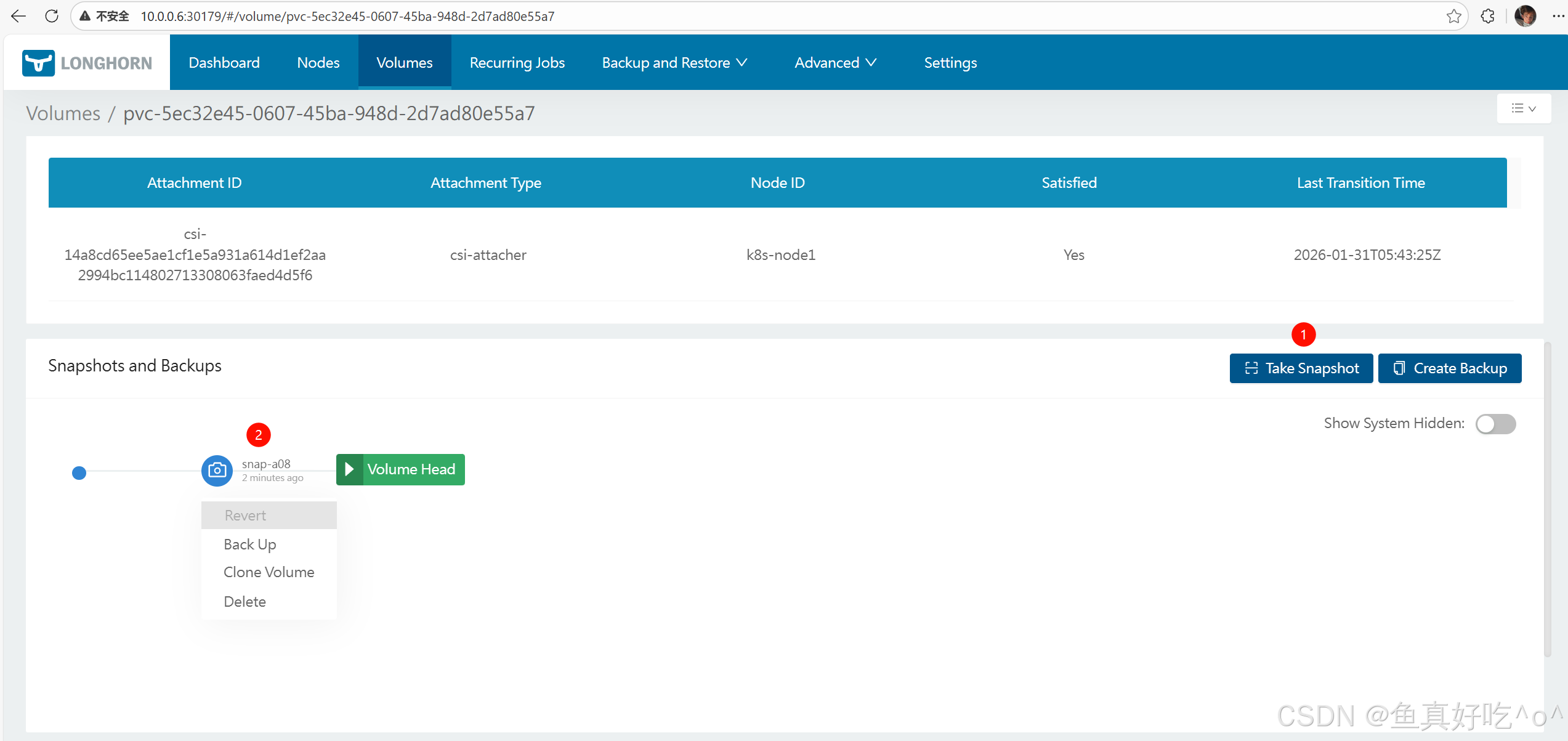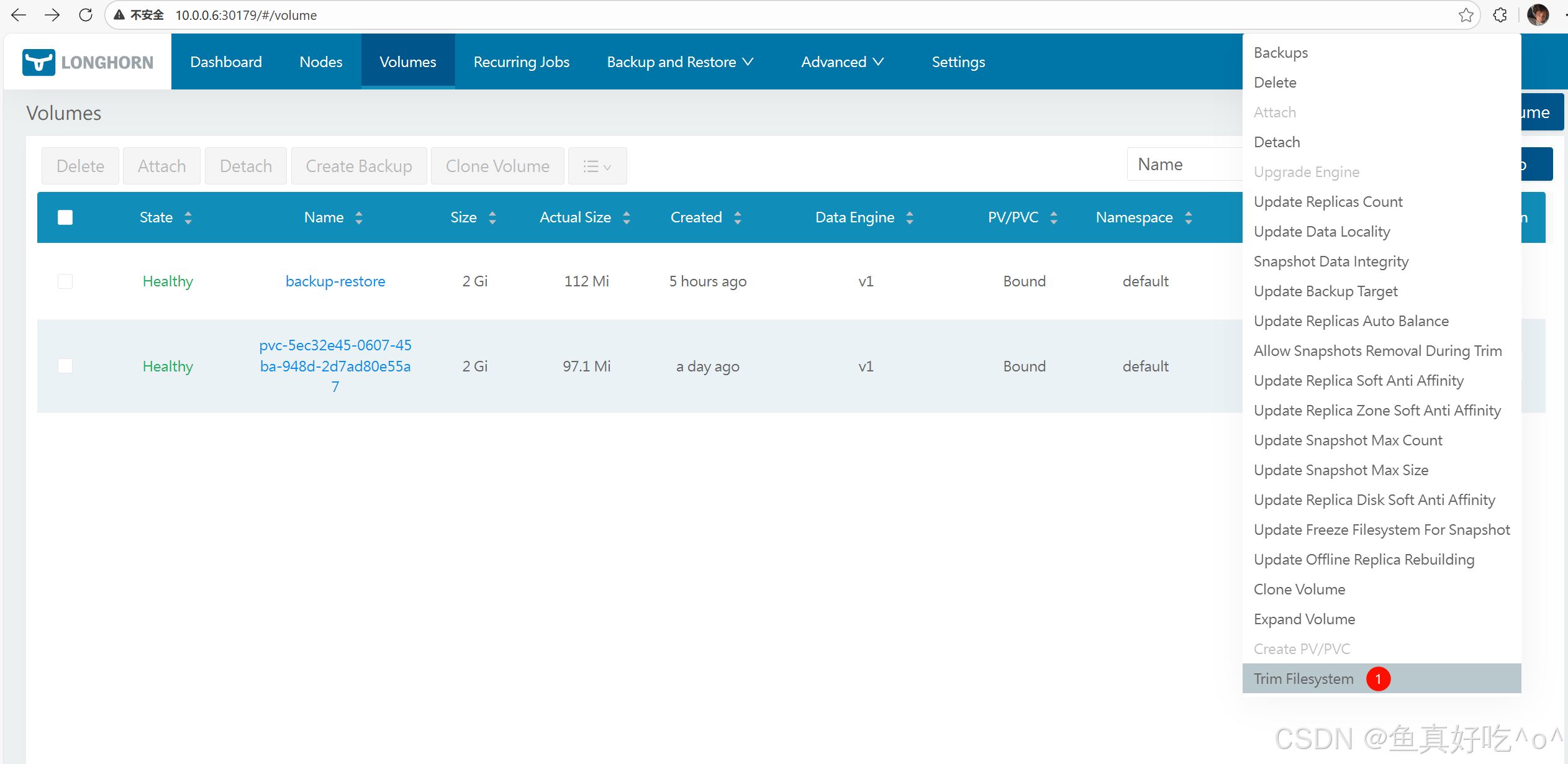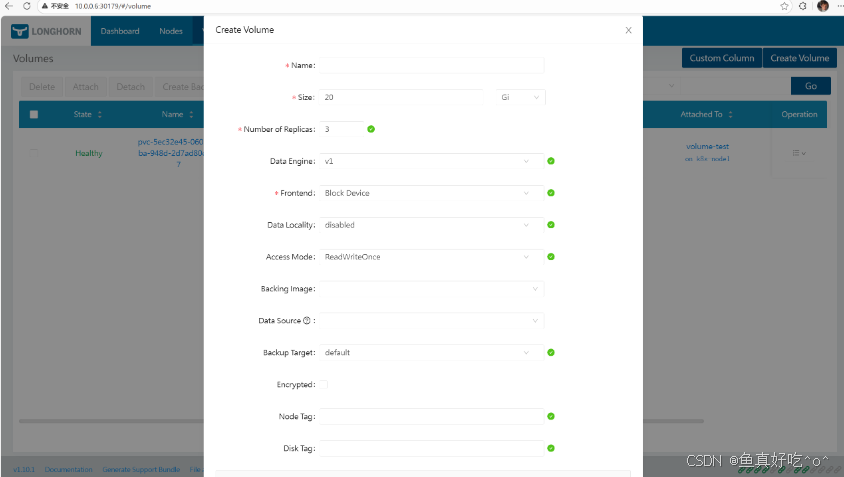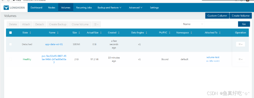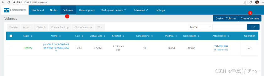 👉 这步生成的 Volume 会出现在 Longhorn 的 Volumes 列表中(此时尚不是 Kubernetes PV/PVC)。
