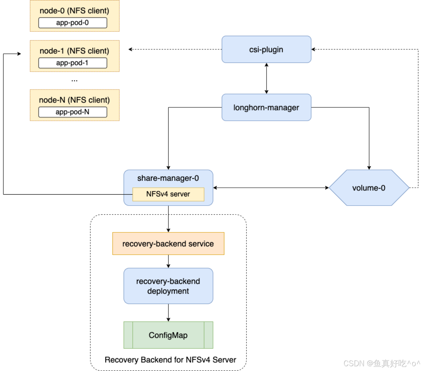 | Longhorn Driver Deployer | Deployment(单个) | 部署并注册 CSI 驱动,确保驱动在集群中正确可用 |