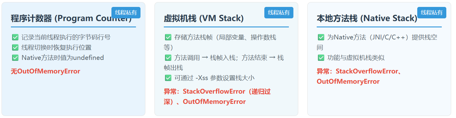 - 线程私有区域:每个线程独立拥有,线程结束后自动释放,无需 GC;