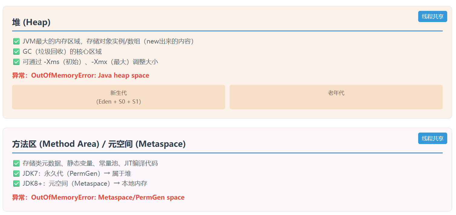 - 线程共享区域:所有线程共用,只有 JVM 退出或 GC 时才会释放,是内存泄漏 / 溢出的高发区。