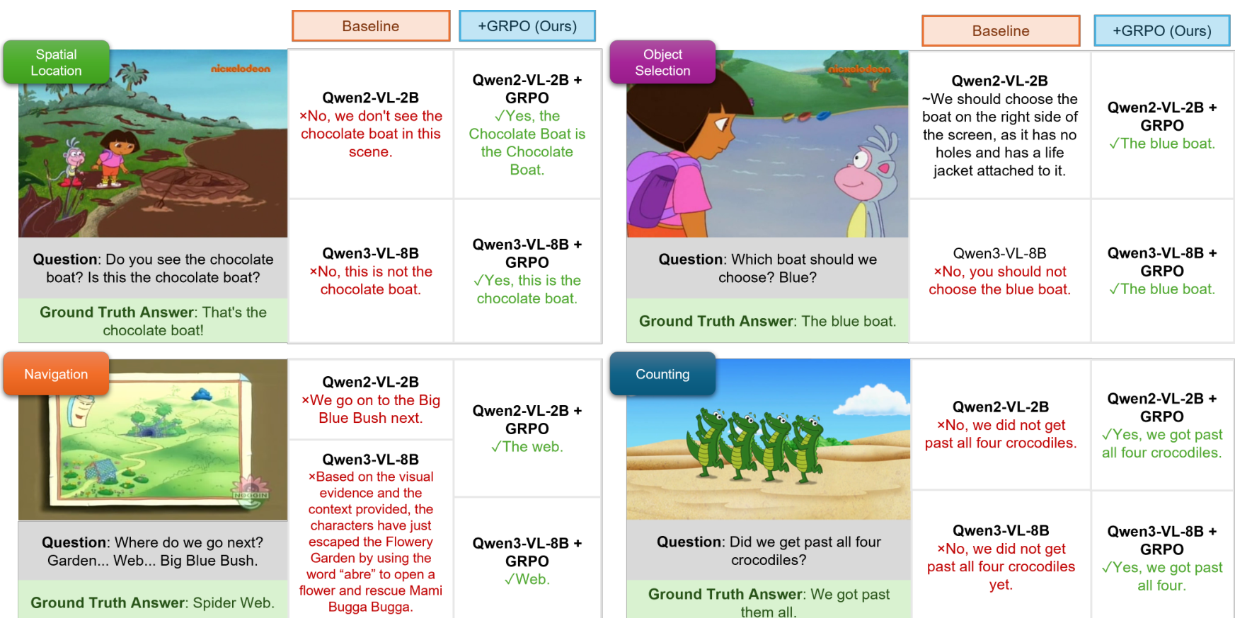 图 3. 定性结果对比 。GRPO 微调后的模型在识别迷彩物体、背景物体选择、序列导航推理以及高密度计数方面表现更优,而基准模型常出现幻觉或失败。