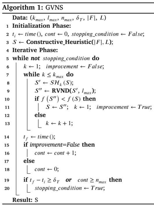 GVNS通过变换邻域结构,结合卡车、无人机和机器人配送,进行局部搜索优化。算法首先构建初始解,然后通过一系列摇动算子生成随机解,并应用随机化邻域搜索(RVND)改进解。若找到更优解,则更新当前解并重置改进计数器。算法通过多次摇动和邻域搜索,探索解空间并在设定的最大迭代次数或运行时间内寻找最优解。