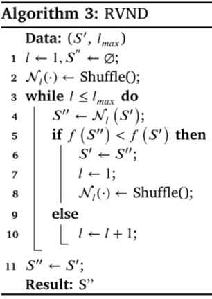 RVND通过随机化邻域集的顺序进行局部搜索,探索多个邻域操作以改进VRPD-RS解。与VND启发式不同,RVND在每次改进时都会重新随机化邻域顺序。算法开始时初始化邻域集并进行探索,每次找到改进解时返回到初始状态。若新解改进了当前解,则更新解并重置邻域搜索;否则,继续尝试下一个邻域操作。