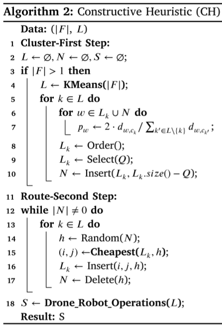 构造式启发式算法包括三个阶段:构建VRP解决方案、插入无人机操作和插入机器人操作,通过k-means聚类和最便宜插入算法构建卡车路线,然后依照目标函数依次插入无人机和机器人。