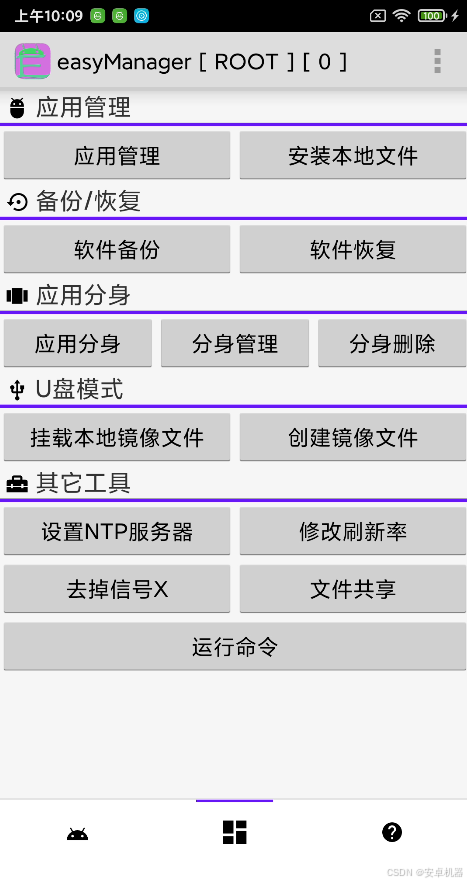 是一个轻量化、核心化、简单易用的安卓系统管理工具,它非常适合在原生系统上使用,它还支持安卓4.0这种老设备上使用,同时也支持最新的安卓设备.正如你所看到的,它不会放弃任何还在使用的旧设备,它会一直支持下去,也许现在刚开始,并不完善,但它拥有无限的未来.
