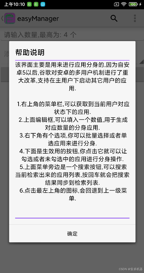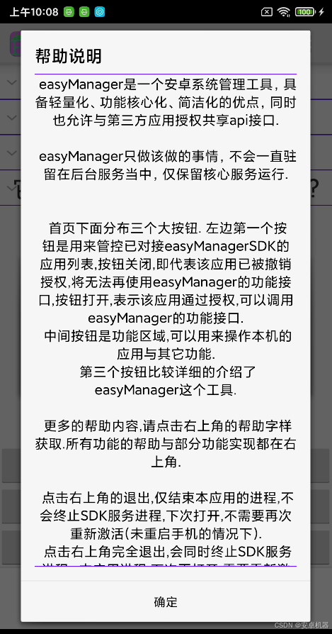 跟Shizuku不同的是,easyManager向下拓展了安卓4.0低版本的支持,同时对外也提供对应的SDK开发包工具,任何接入SDK的第三方程序,都可以通过SDK来使用easyManager完整的、私有的功能函数接口,大部分常用的功能都不需要开发者再次实现,easyManager已经全部封装好了,开发者只需要关注界面交互部分. 并且,easyManager对外开放的接口是经过测试的,支持安卓4.0到最新版本,它们工作稳定而且正常.