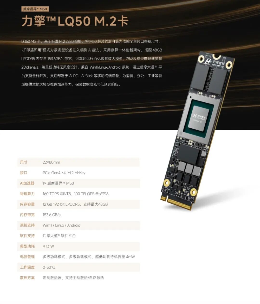 后摩智能于去年发布的 M50 芯片,在典型功耗仅 10W 的前提下,已能提供 160 TOPS 的算力;并配备最大 48GB LPDDR5 内存;带宽速度达到 153.6 GB/s;可以支撑 30B 大模型 25+ Tokens 的推理速度。
