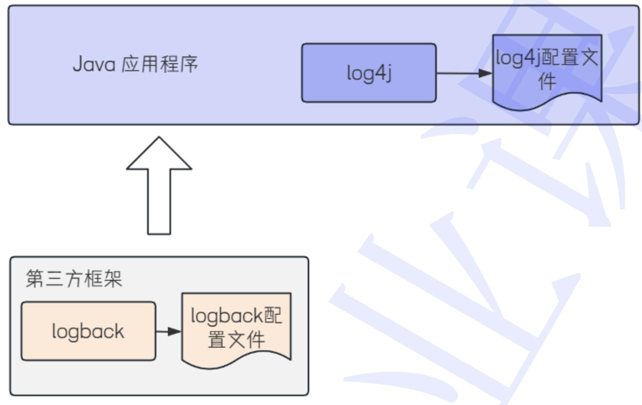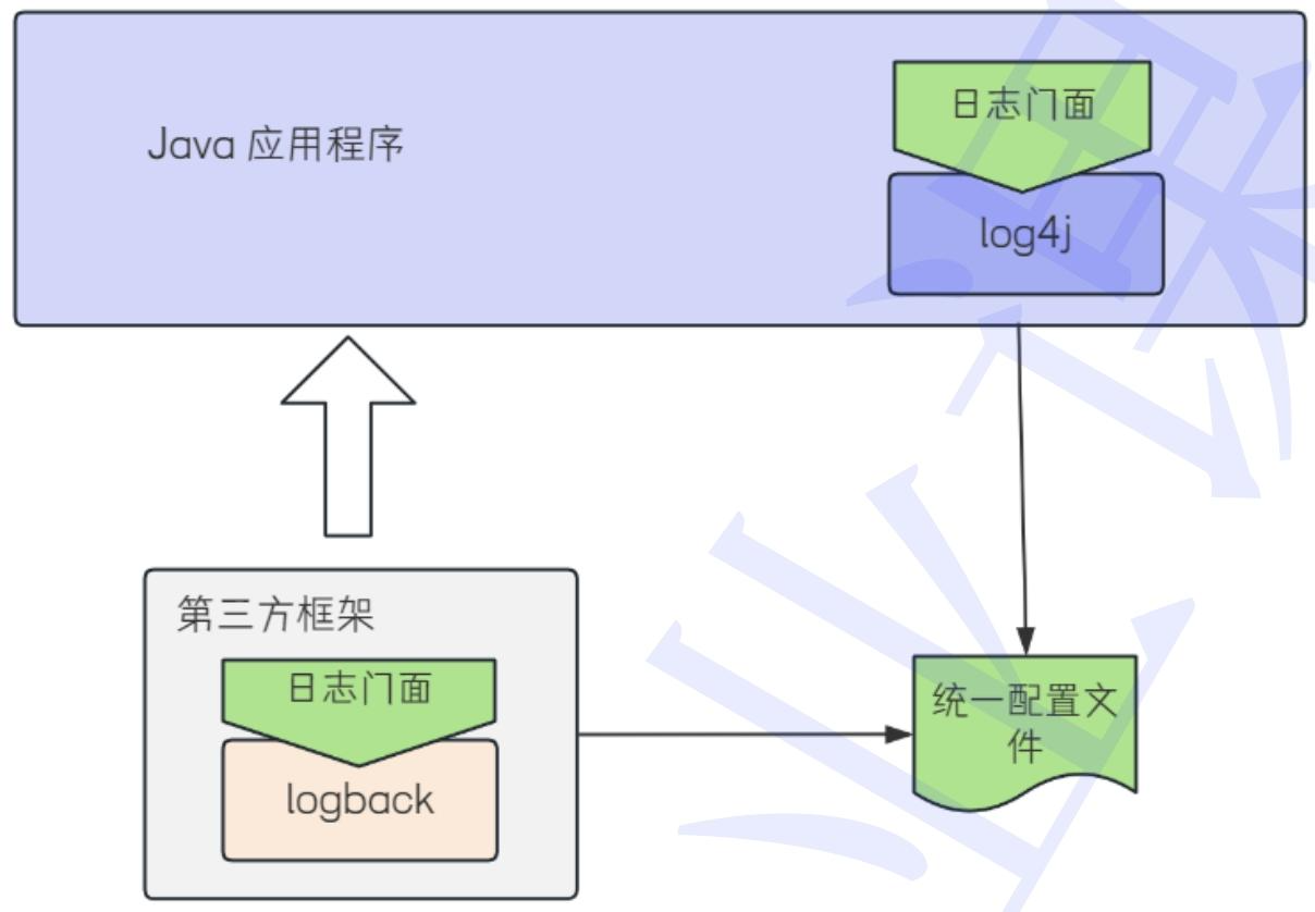 引入 SLF4J 作为日志门面后,应用程序与具体日志实现框架之间通过统一 API 交互,可解决上述问题,简化配置、统一第三方适配。