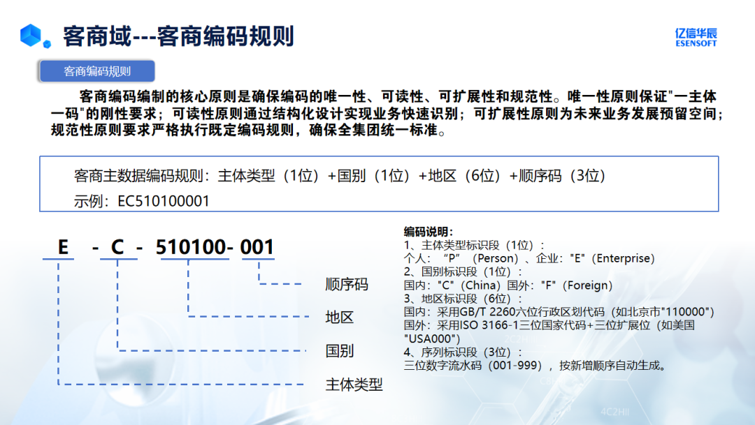 为解决这些问题,亿信华辰项目组提出"客商一体"编码方案,以"主体+国别+地区+顺序码"结构支持数据分析与钻取。