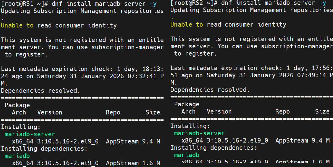 # 在 RS1/RS2 上安装并启动 MariaDB